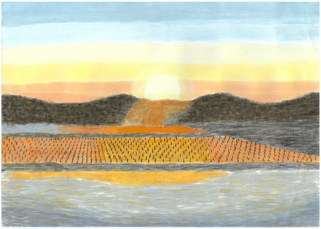 夕日の浮かぶ水田 |