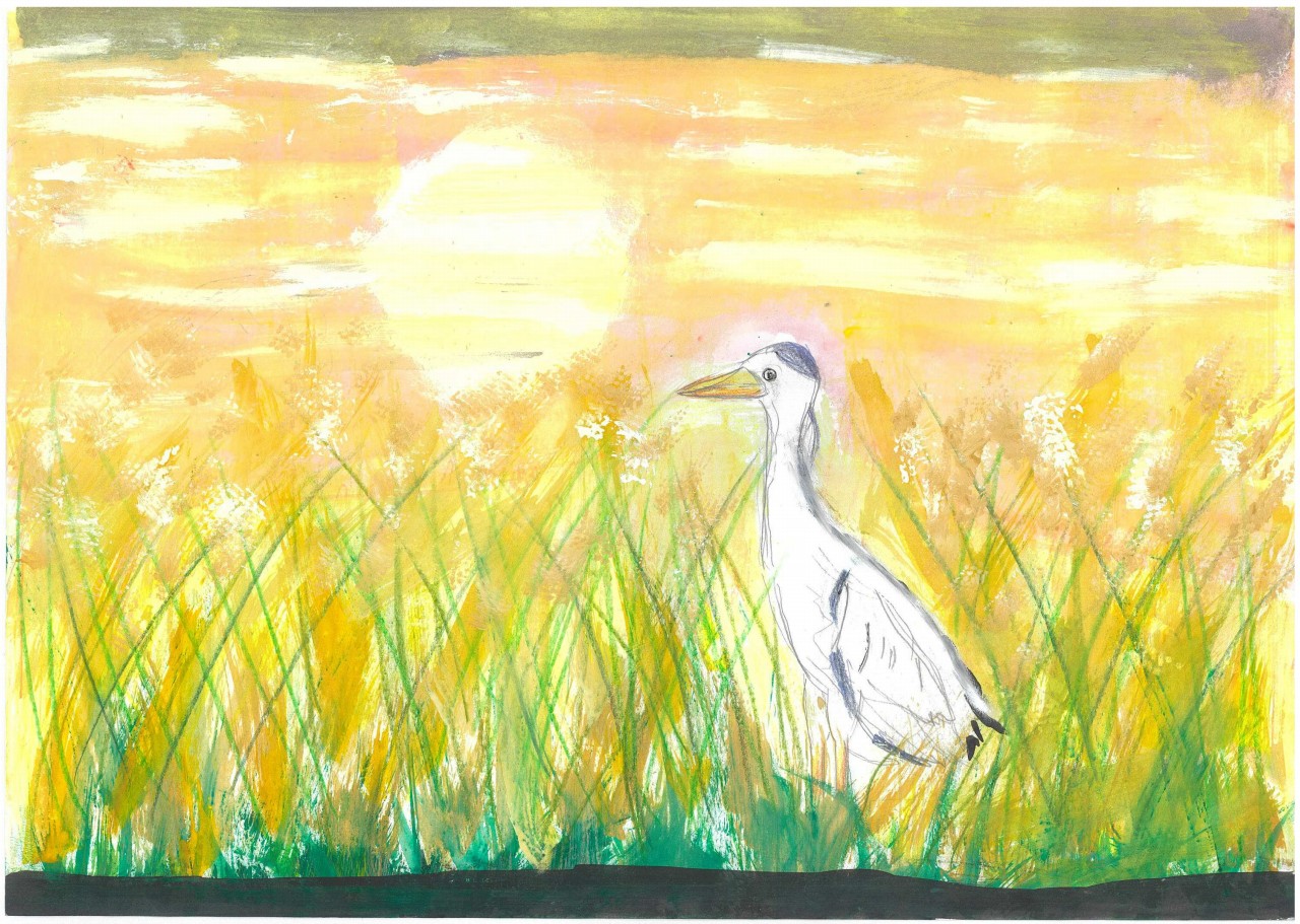 アオサギと稲穂・夕陽のスポットライト |