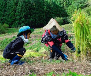 撮影意図:金山棚田での稲刈りで親子で子供が稲刈りに興味を持った。