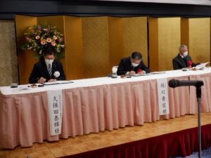 調印式には、牛崎清巳巾下自治会長、小田島範雄上似内振興会長、絹川貴宏有電社岩手支店長、上田東一花巻市長、久保田理事長のほか、来賓の佐々木忍北上農村整備センター所長ら約20名が出席しました。