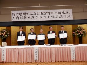 久保田理事長は「近年、農業・農村を取り巻く環境が厳しさを増しており、多くの農業水利施設を土地改良区だけで維持してくことが難しい状況にある。このような中、今般アドプト協定を新たに3団体と締結できることとなり大変心強く思っている。本日の協定締結が、多面的機能の発揮の一助となることを期待する。」と挨拶を述べ、協定書の調印が行われました。