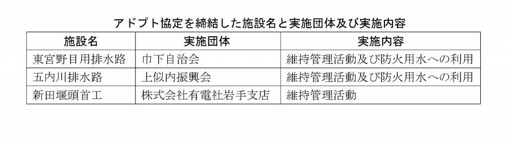 2月17日、豊沢川土地改良区(久保田泰輝理事長)は、巾下自治会、上似内振興会、株式会社有電社岩手支店の3団体と花巻市とで、3ケ所の農業水利施設について、維持管理活動や防火用水への利用に関するアドプト協定を締結しました。
