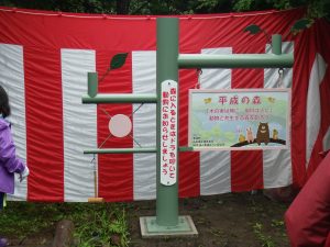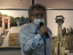 午後には、山王海ダム上流に会場が移され平成の森モニュメント除幕式が行われました。開式に当たり大沼理事長から、「本日のふれあい研修では様々な事業を取り入れています。また、平成25年度から取り組んでいた推進活動業務も今年度で一段落します。今回建設したモニュメントは、今後の平成の森の活動を紫波町、紫波みらい研究所、山王海土地改良区が連携して継続していくための誓いと、みなさんがこのモニュメントを見たときに農業用水施設の重要性、森林の大切さを思い出して貰えるよう、ここに建立させていただくものです。」と挨拶しました。