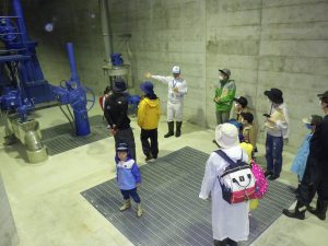 参加者は、土地改良区職員から親子ダムである山王海ダムと葛丸ダムについて、その歴史や目的、構造についての説明を受けた後、取水放流設備や放流バルブ室、漏水濁度室(ろうすいだくどしつ)を見学しました。普段見ることのできない機械設備などについて参加者は、熱心に学んでいました。