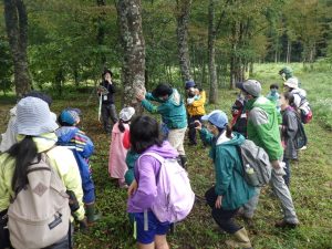 続いて、紫波みらい研究所の案内で自然観察会が行われ、参加者は平成の森に植えられている植物について研究所の職員から説明を受け、熊の爪痕が付いた樹に実際に触れ観察したり、アケビなどの食用の果実を食べてみたりと貴重な体験を楽しんでいました。