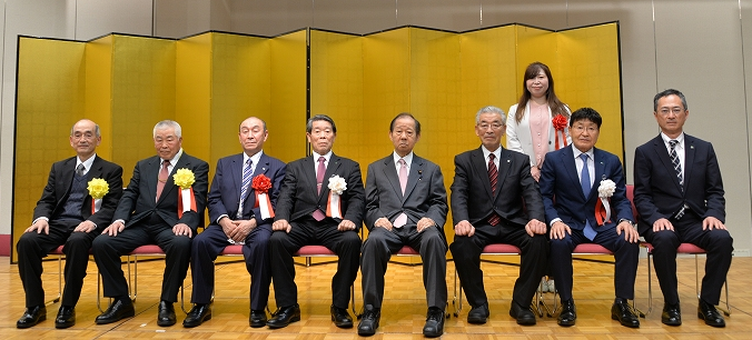 加藤正明 小本川土地改良区理事長、佐々木章一 都南土地改良区理事長、二階俊博 全土連会長、大宮惇幸 本会会長、
