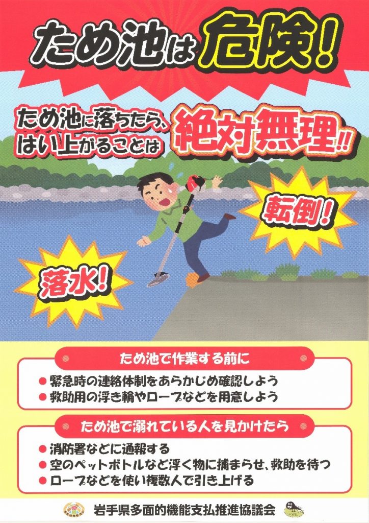 岩手県多面的機能支払推進協議会では、令和4年8月に発生した「ため池堤体法面の草刈り作業中に発生した死亡事故」を受けて、水路及び農業用ため池水難事故防止研修会の開催やいわて農地・水通信の号外発出などを行ってきましたが、今年度の取組として標記ポスターを土地改良区やため池を管理する活動組織等に順次配布しているところです。