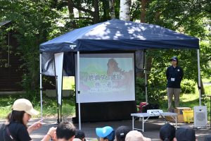 その後、雫石町土地改良区の職員が、管理している日影堰頭首工について受益面積が594haあり、東京ドーム約126個分の面積に水を送っていると参加者が施設の規模をイメージしやすいように説明を行いました。また、たくさんの水を送っているがその分危険も多くあるということも伝えていました。