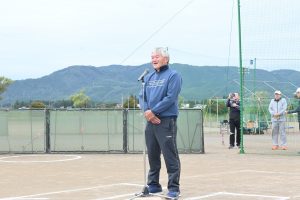 開会式で本会の髙橋隆会長は「多くの皆さんにご参加いただき、心から感謝申し上げる。この大会で健康づくりと親睦を深めるとともに、選手と応援団が一丸となって熱戦を繰り広げ、大会を盛り上げていただきたい」と挨拶。昨年優勝チームの選手宣誓の後、髙橋会長の始球式で試合が開始されました。