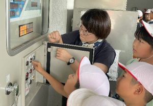 児童たちは、最初の見学地「中央幹線用水路」で、用水路に流れ込んでしまう草木やゴミを除去する除塵機の仕組みについて説明を受け、実際に操作を体験。除塵機がどのように動いているのか間近で見て、その役割を学びました。