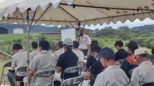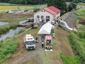 訓練には、土地改良区の関係者に加え、国(土技所)・県(農村整備C、土木C)・市(農林部、消防署)の関係機関及び近隣土地改良区や農業法人等の関係団体から、合わせて50名が参集しました。