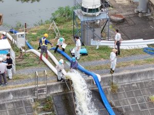 今回借り受けたポンプ設備は、水中ポンプ口径200㎜×1台と排水ポンプパッケージ(口径200㎜×2台)1セットで排水作業を行うとともに、排水ポンプ車(口径200㎜×6台)と小型ポンプ車(口径300㎜・150㎜が各1台)の展示をしました。