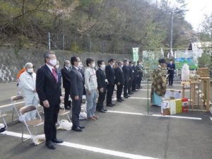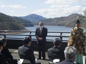 神事には、栗田徹東北農政局北上土地改良調査管理事務所長、佐々木忍岩手県南広域振興局農政部北上農村整備センター所長、上田東一花巻市長ほか関係者約20名が参列し、取水の安全と農作物の豊穣を祈念し玉串を奉奠しました。